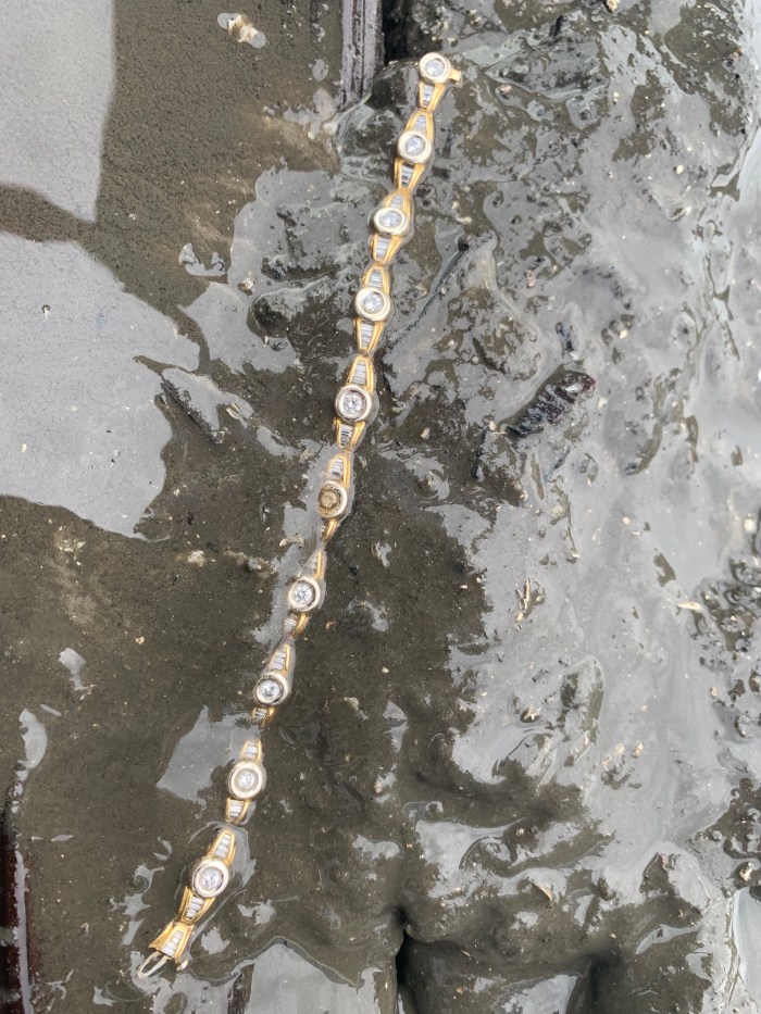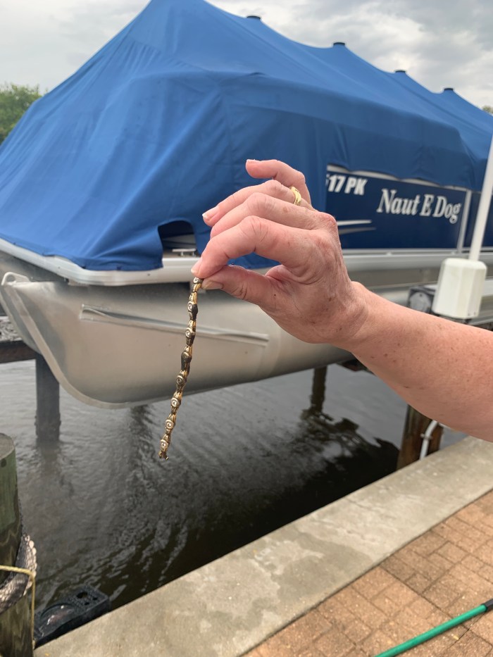 [July 11, 2019 – Ft. Myers] While helping to secure a boat cover, a rope caught on Wilma’s gold bracelet tugging it off her wrist and into the water adjacent the dock. Her husband also heard it go “kerplunk” on the dock and splash as it disappeared into the murky water. Remember, “It’s only lost until you call!”